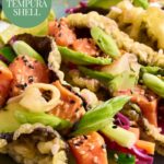 Using chopsticks or tongs*, carefully fish the now crispy Sushi Taco shell out of the hot oil. Drape over the wooden spoon with the tempura batter to the outside and carefully shape into a shell shape. Leave for a minute or so, while you dip the next nori sheet and glide it into the hot oil.