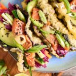 Sauce – While you can use an easy Sriracha mayo if you prefer, I opted for a sort of Asian vinaigrette that doubles as marinade for the salmon. Mixing rice vinegar, lime juice, soy sauce, sesame oil with some ginger and garlic gives you a super flavourful dressing to drizzle over the filling.