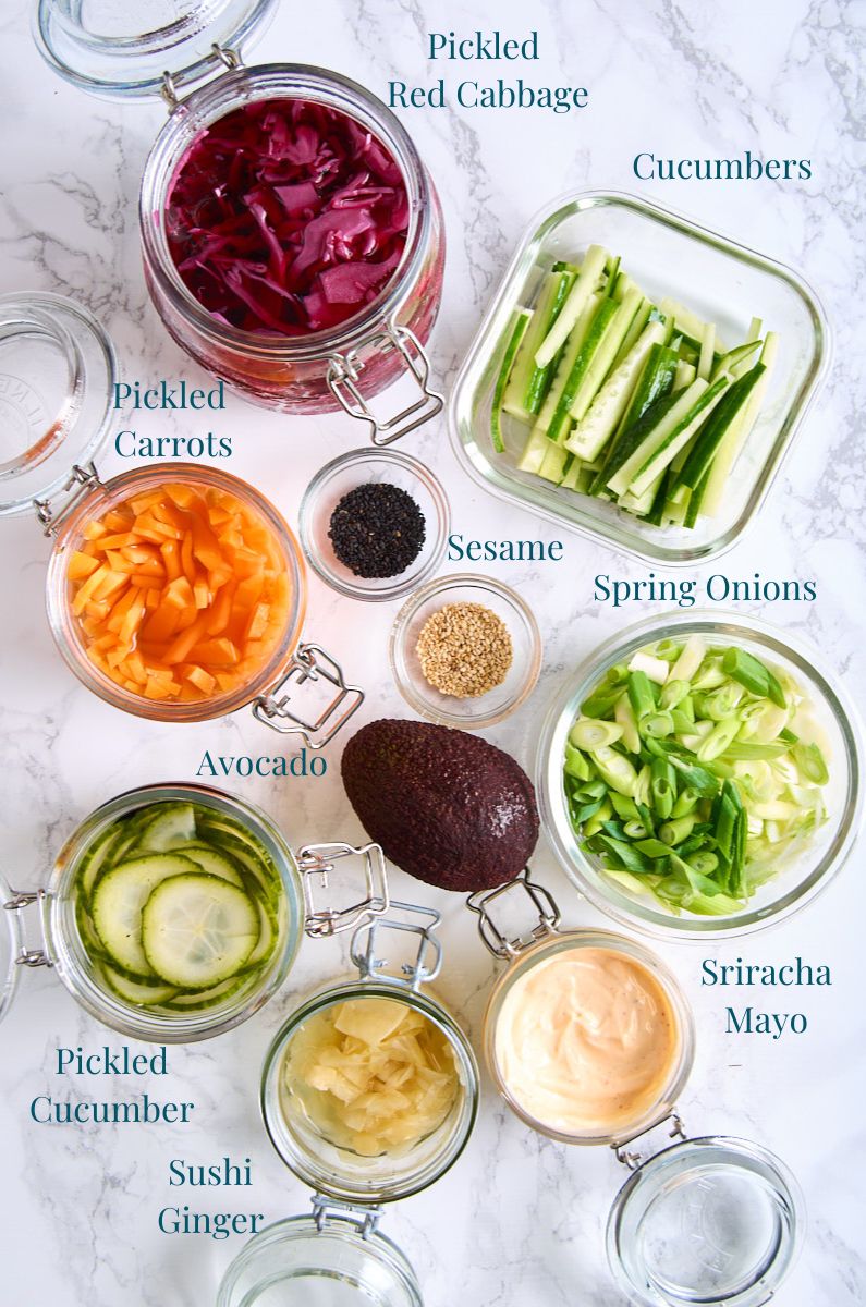 To get ahead, prepare the quick pickled veggies a day or two before. This way they are more flavorful and you have a stress free meal. They keep in the fridge for about 2 weeks.