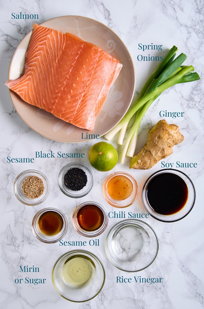 Salmon – I’m using very fresh, raw salmon filets here, that gets marinated briefly in soy sauce, lime juice, sesame oil and ginger. The lime juice “cooks” it ever so slightly but keeps it very tender and juicy.
