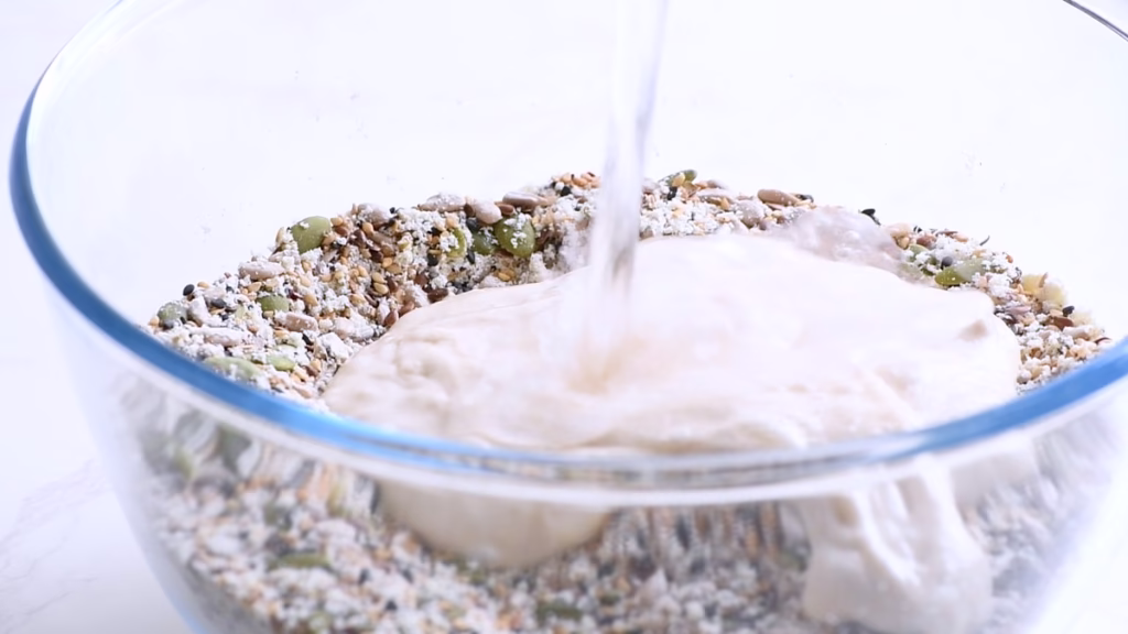 While I give my sourdough a little whisk together with the water in a jug in the video, you could absolutely just mix everything together in one bowl and be done. The whole hands-on process takes all of ten minutes and can hardly be called work, it’s so easy.