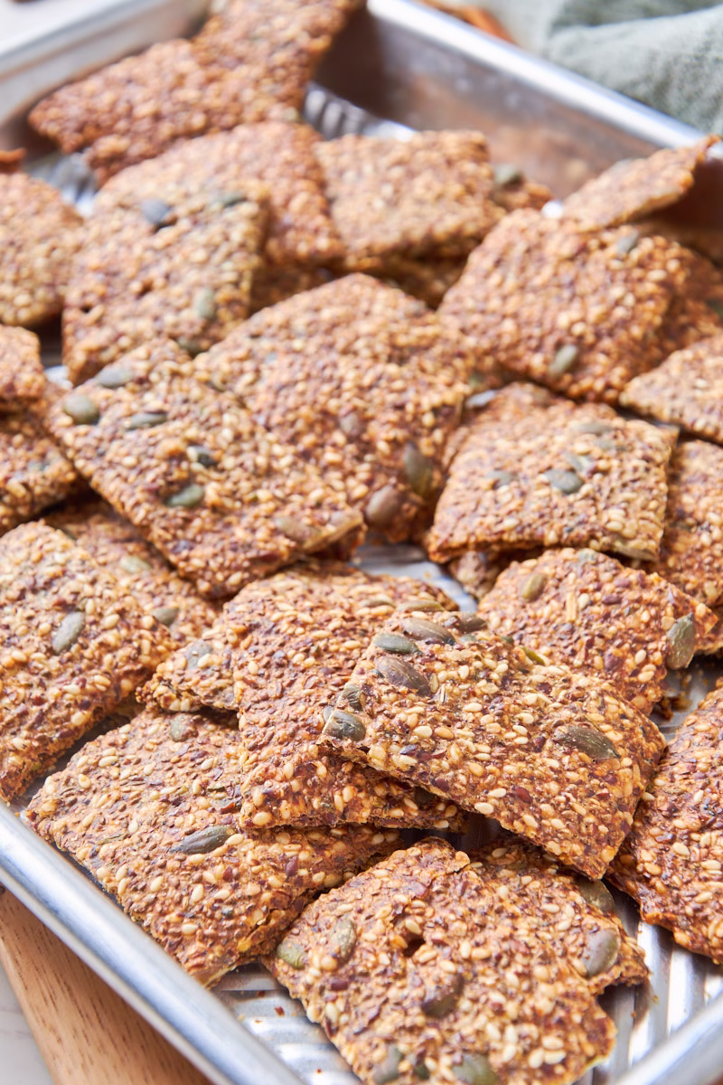 These seeded protein crackers are crunchy, flavorful, and full of goodness. The sourdough tang and high protein make them the perfect healthy snack.