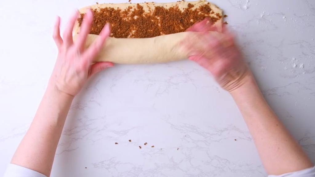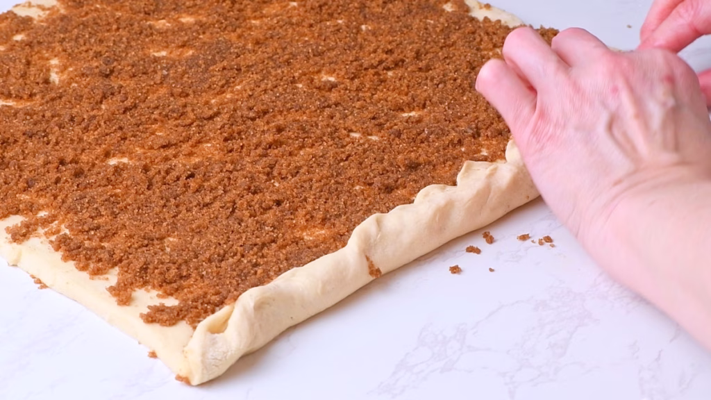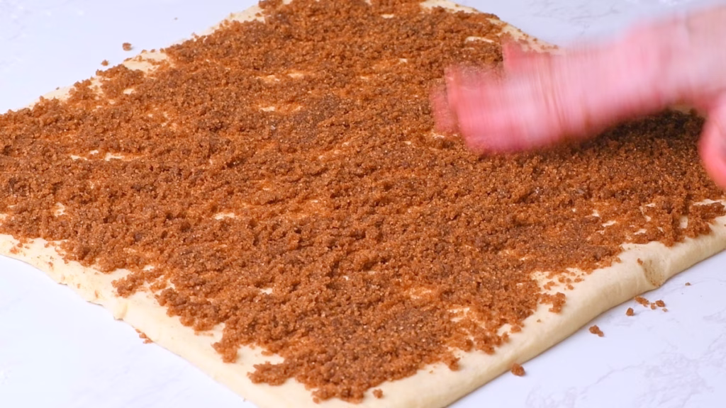 - Sprinkle all of your brown sugar-cinnamon-butter mix over the dough. Use your hands spreading it around. Make sure to cover it all the way to the sides. This will give you the caramelized cinnamon all the way through without any odd “just dough” ends.