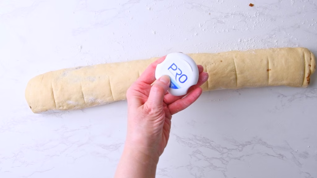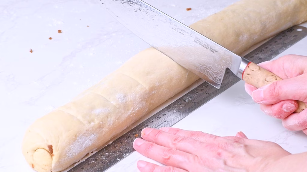 - To get really evenly baked cinnamon rolls, you want to make sure they are as close to being the same size as possible. I use a ruler and a sharp knife, marking the top of the log for 1 ½ inch / 4 cm wide pieces.
