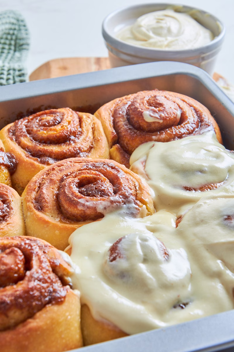 - The timing of applying the frosting matters – If you apply your frosting on the rolls right out of the oven, it will just completely melt and run off. If you apply it when they are cold, it won’t melt at all and just sit on top.