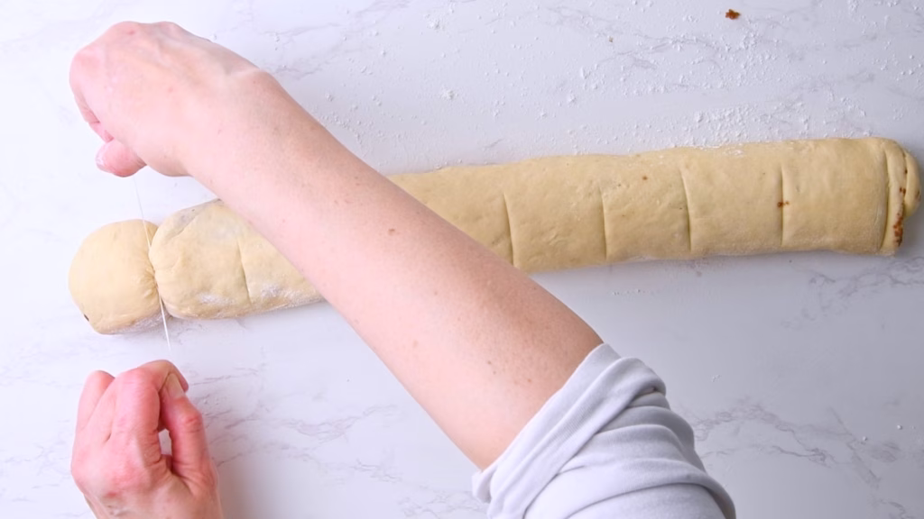 - Using kitchen or sewing twine to portion – I found this to be the easiest method by far, leading also to the best looking results. A knife, even a very sharp one, will always squish the rolls a bit, while cutting and then rolling them one by one looks incredible in videos, but I found it messy at best and rather labor intensive.