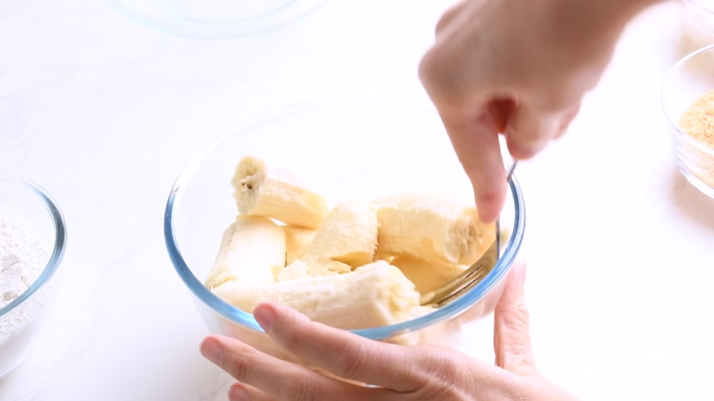 • Now mash your bananas either in the bowl with the butter or in a small separate bowl (might be easier, but if you only want to wash one, it’s fine in the big bowl).
