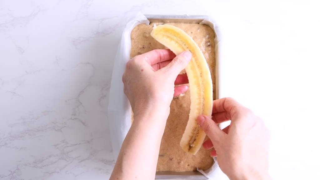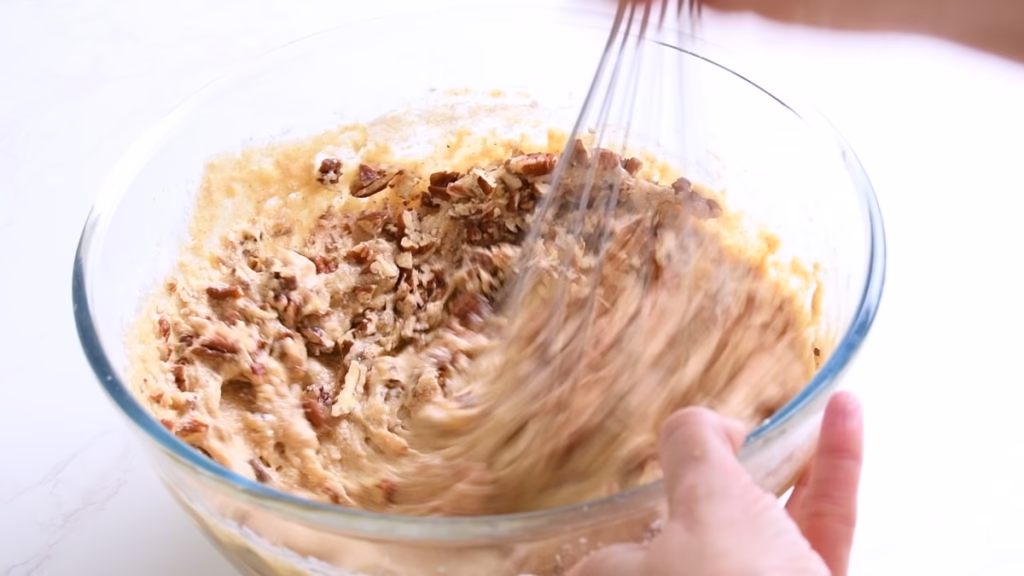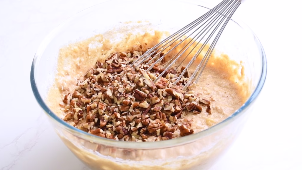 • Sprinkle over the chopped pecans and fold in until you see no dry flour. It’s fine if the batter is a bit lumpy. This will result in the fluffiest banana bread.