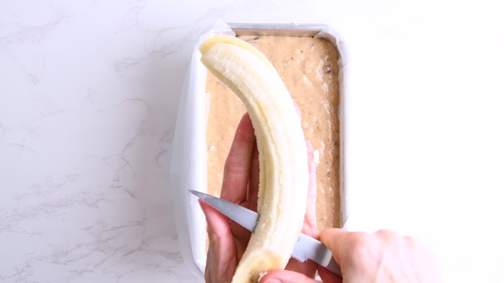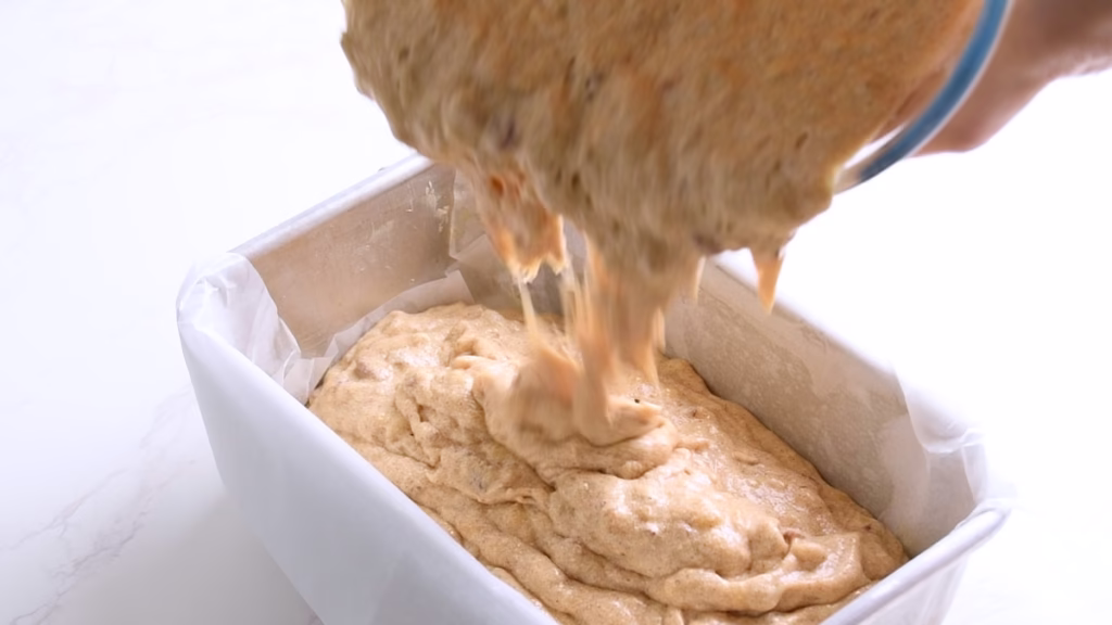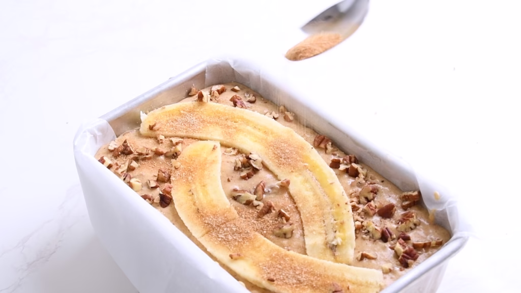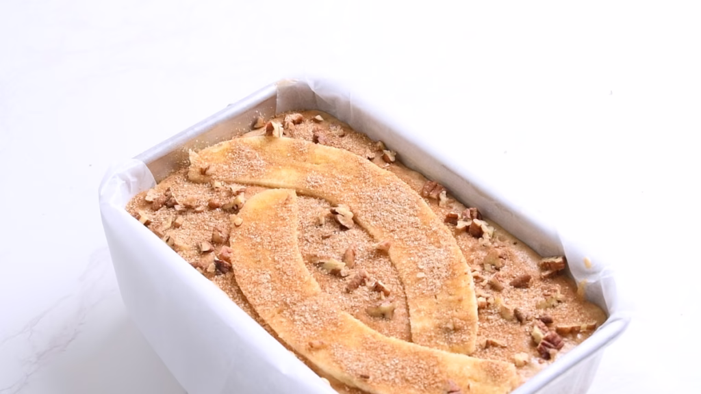 • Transfer the batter into the prepared loaf pan and sprinkle with a few more chopped nuts if you like or some cinnamon sugar.