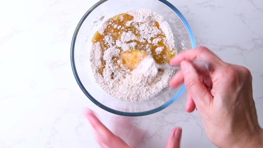 - Using a fork or spoon, stir all the crumble ingredients together until well combined but crumbly.