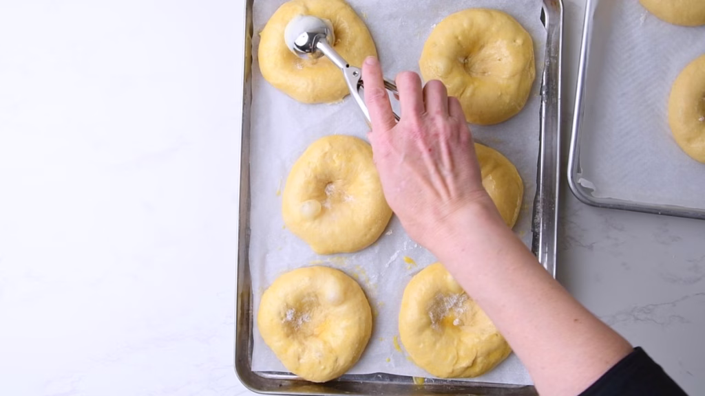 - I dipped the round bottom of the large scoop into flour between pieces, then pushed into the center of the dough until a nice deep well was formed, leaving a thin layer of dough intact to hold the filling.