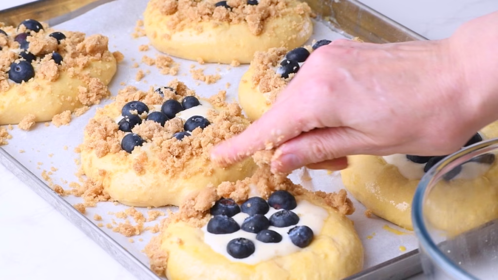 - Then, using your hands to form crumbs of your favorite size (I like a mix best), scatter mostly over the rim of each Danish with the crumble topping.