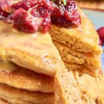 Yum. Fluffiest pancakes ever. And as a bonus, they are high in protein! I had some leftover cranberry sauce in the freezer from Thanksgiving, so it was a spot suggestion for a topping. Thanks!! Delish. 🙂