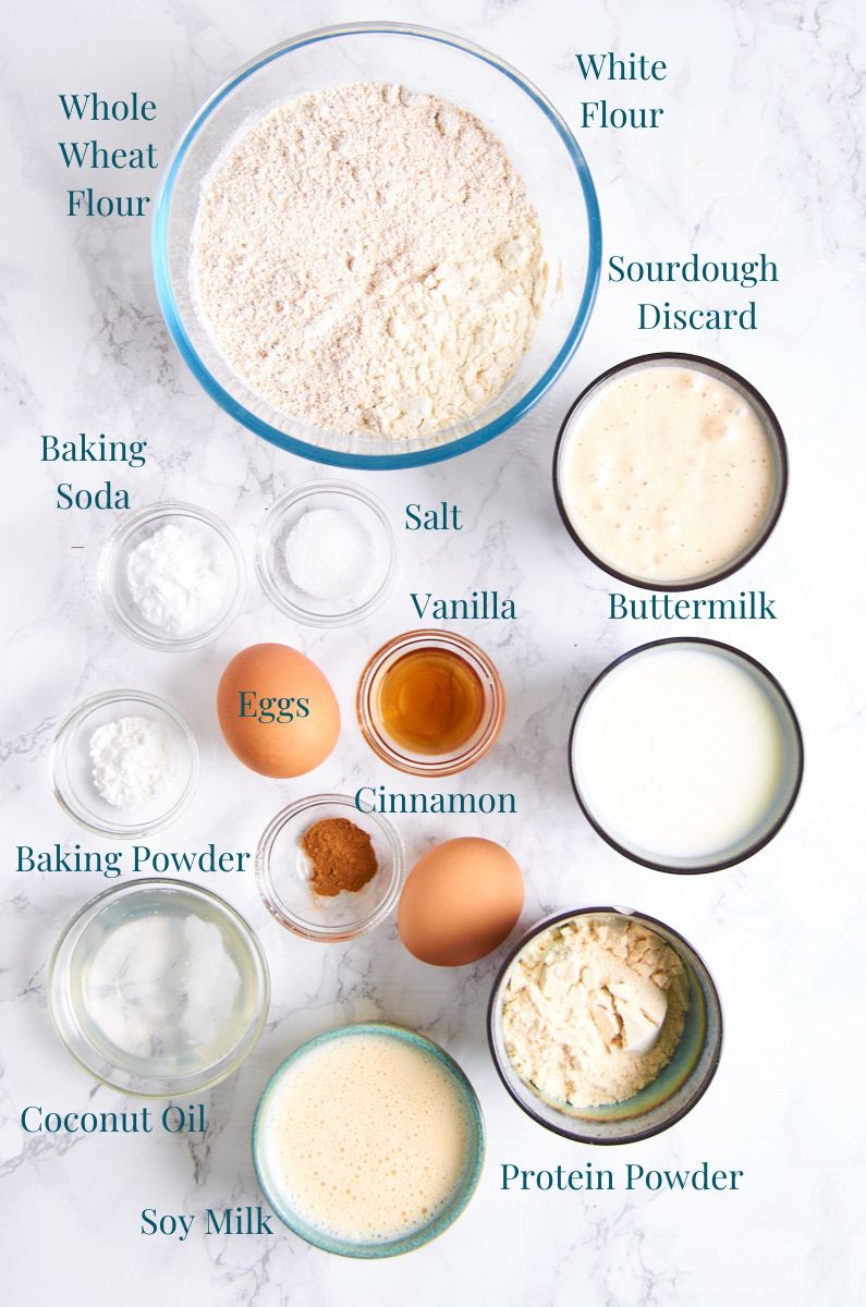 - In a large mixing bowl or blender, combine the sourdough discard, buttermilk, soy milk, protein powder, eggs, melted coconut oil, and vanilla extract. Mix well until the ingredients are fully incorporated and no protein lumps are left.