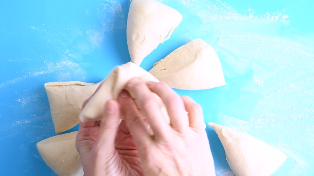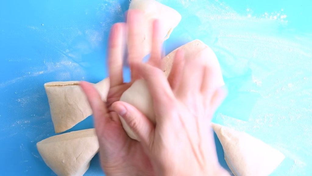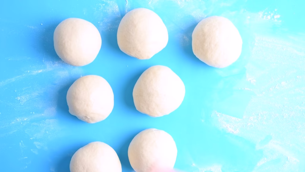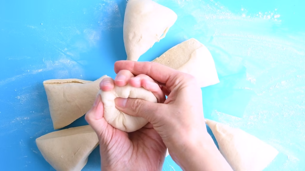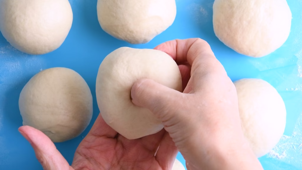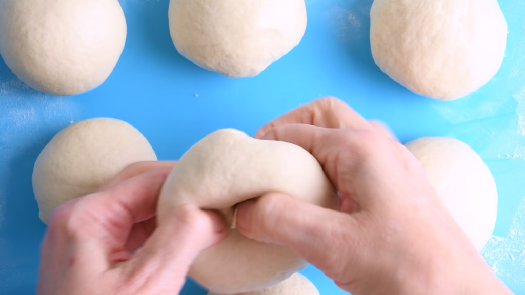 - Now shape each of the dough pieces into a nice, tight ball by grabbing the corners and pulling them into the center, pinching them to close, until you see and feel some surface tension. Turn the ball over, so the seam side is in the palm of your bottom hand and roll until smooth.