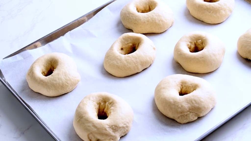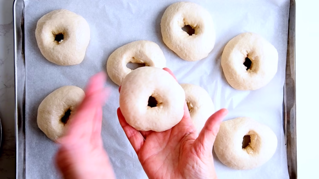- Shake off the excess water or rest on a wire rack while you finish the remaining bagels.