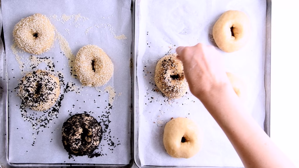 - Now you can either sprinkle on your preferred toppings (I like my lower bagel half topping free, so I sprinkled the top) or you can roll the still wet bagel in the seeds to cover it all over.