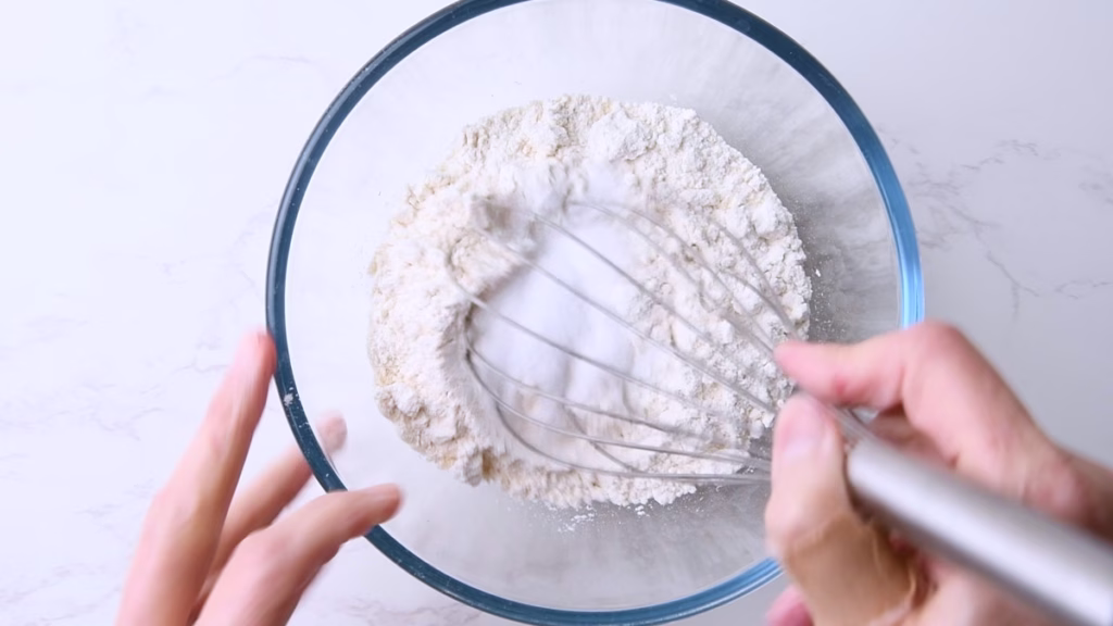 - Either right in your large mixing bowl or in a smaller separate bowl, add the baking soda and salt to your flour and give it a stir, so the three are well combined.