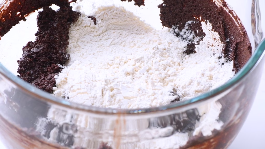 - Now switch to a spatula and gently fold your flour mix into the chocolate-mint mass. Just until no dry flour lumps are left. Don’t overmix or your cookies might come out tough and chewy due to too much gluten developing.
