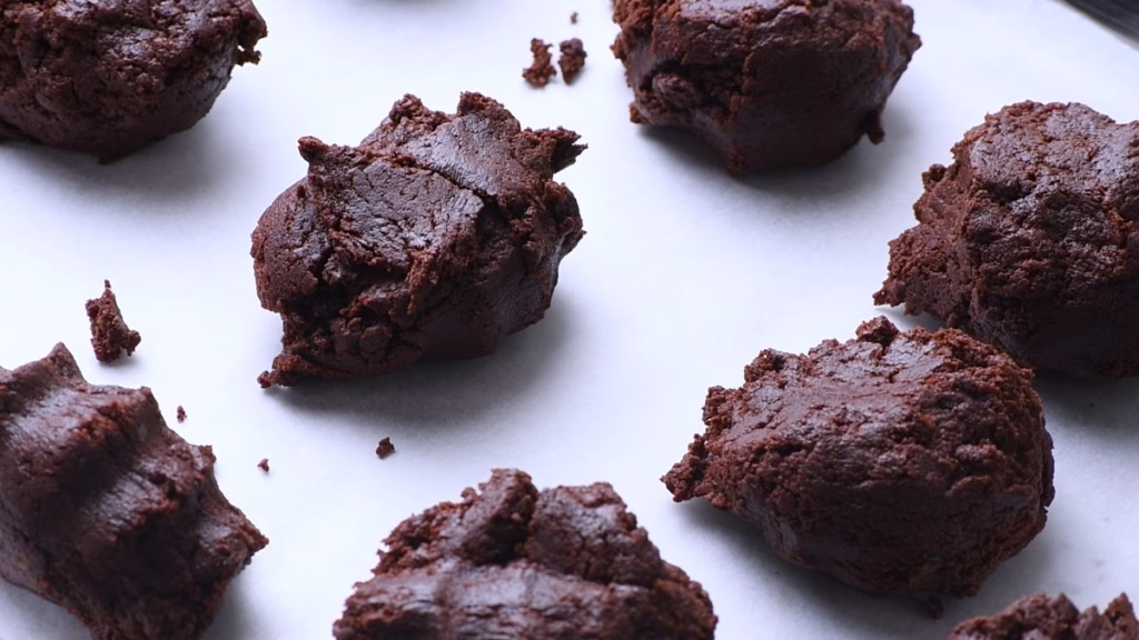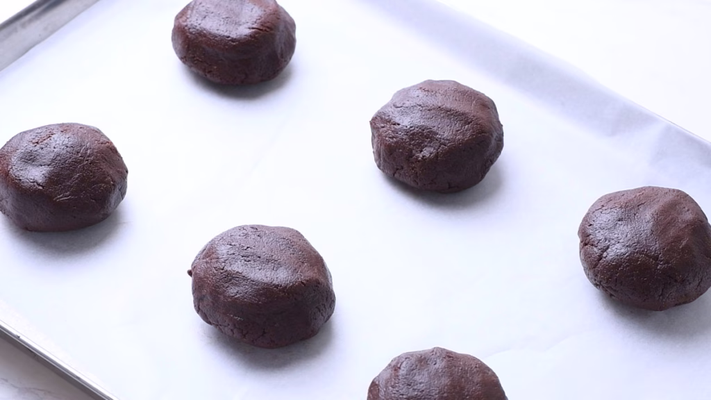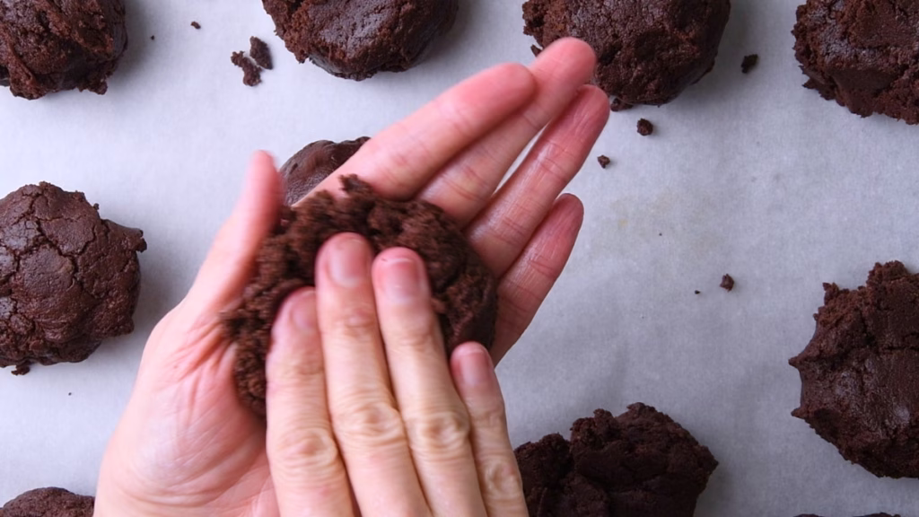 - Now grab a portion of the dough and flatten it in your palm. Due to all the cocoa butter from the chocolate they should be reasonably non-stick. And sure a little mess while baking is to be expected.