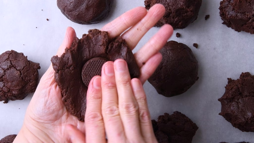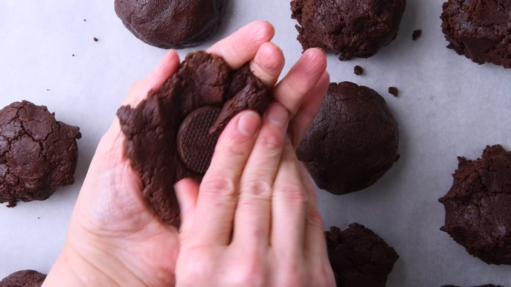 - Pop the mint into the center, then close the cookie dough over it. Turn the portion over, seam side down on your palm, and, cupping your other hand over it, move in rapid little circles until you have a relatively round cookie shape.