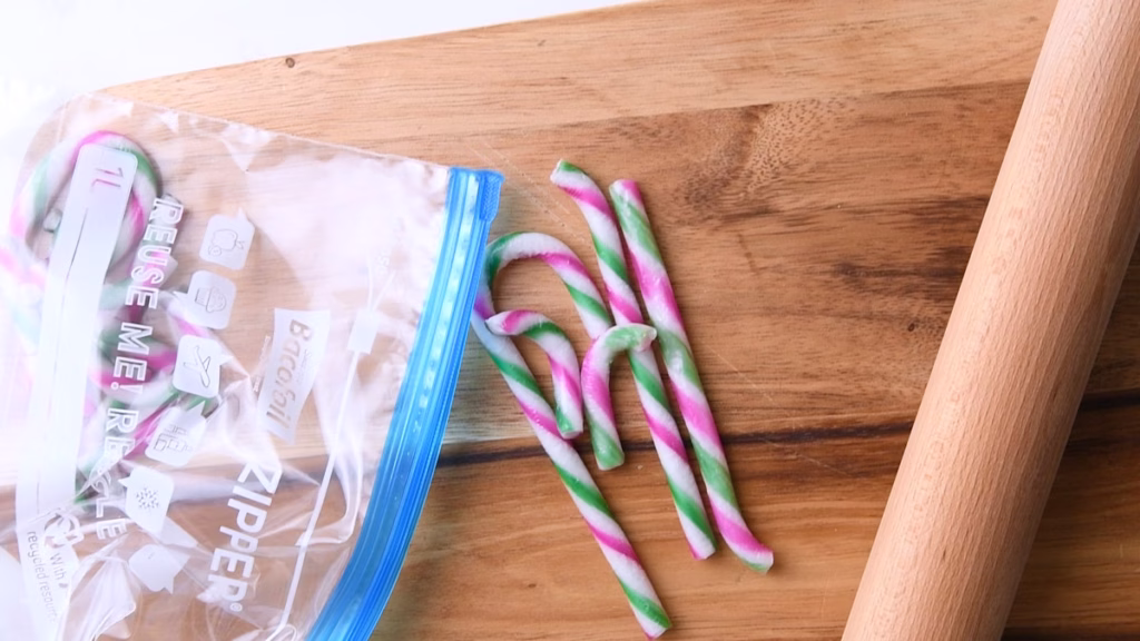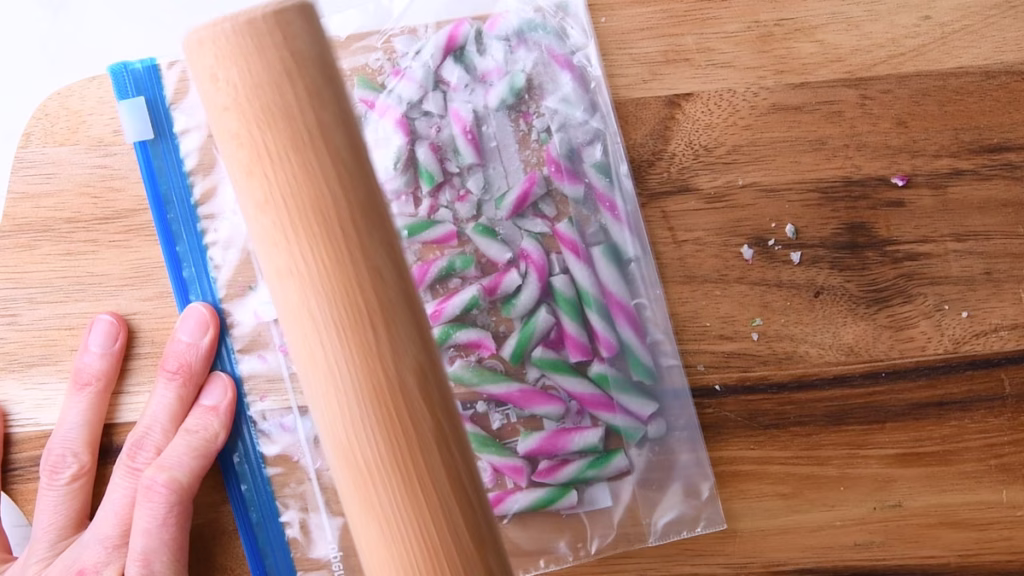- Crush your candy canes. I snapped them into pieces which I put into a strong freezer bag (to prevent any bursting candy cane accidents) then smashed the bunch with my rolling pin on a wooden board.