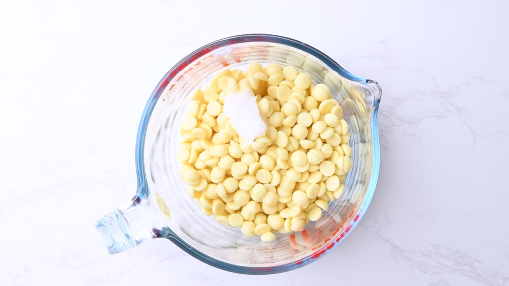 - In a microwave save bowl or in a double boiler, mix the white chocolate chips (or chopped bars) with the coconut oil. Just dollop it in, it’ll be fine.