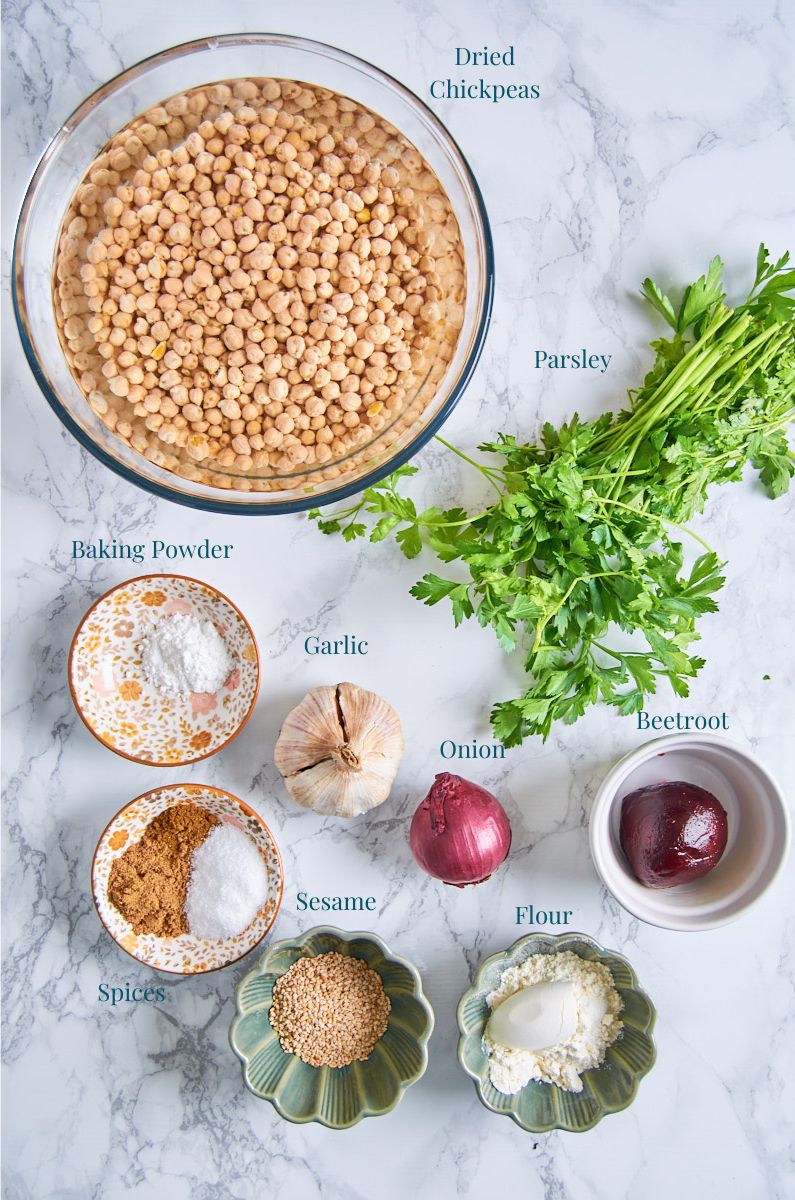 Apart from that: Onion, garlic, a bit of flour or chickpea flour, fresh parsley, ground coriander and/or cumin, salt and baking soda are all you need for the basic version.