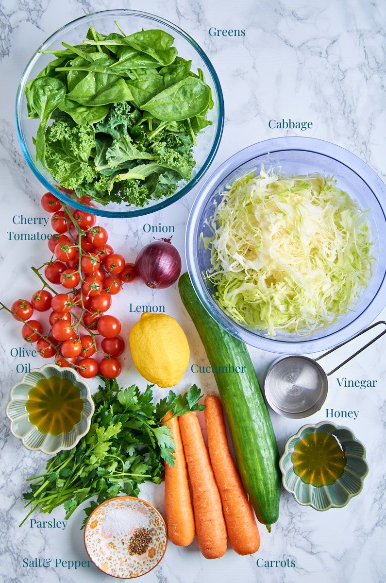 - Top with massaged kale, baby spinach, pickled cabbage, grated carrots, cucumber-tomato salad, and hot Falafel.