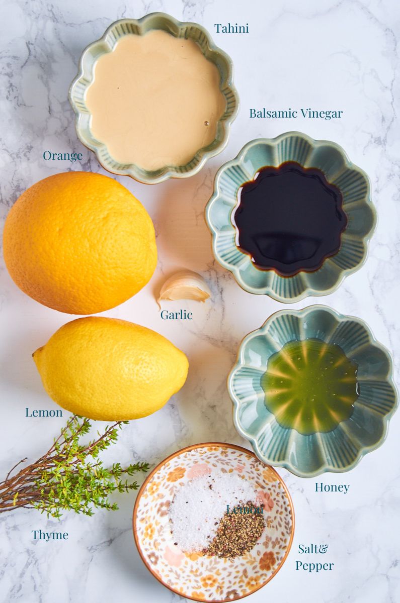 - Prepare the dressing the day before by mixing Tahini, orange and lemon juice, orange zest, honey, balsamic vinegar, minced garlic, thyme, and salt in a jar until creamy. Store it in the fridge (it will keep for about 4 days).