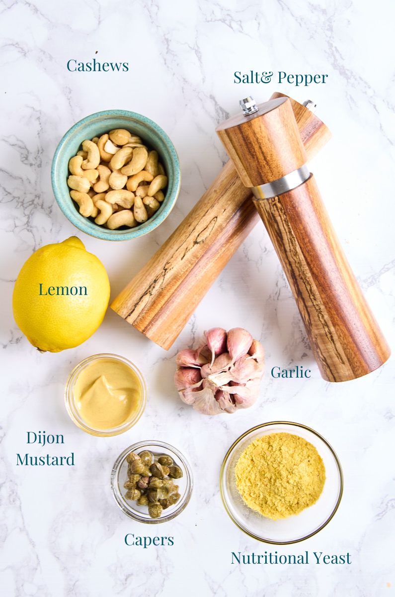 - In a blender, combine soaked cashews, water, lemon juice, nutritional yeast, Dijon mustard, capers, and garlic cloves.