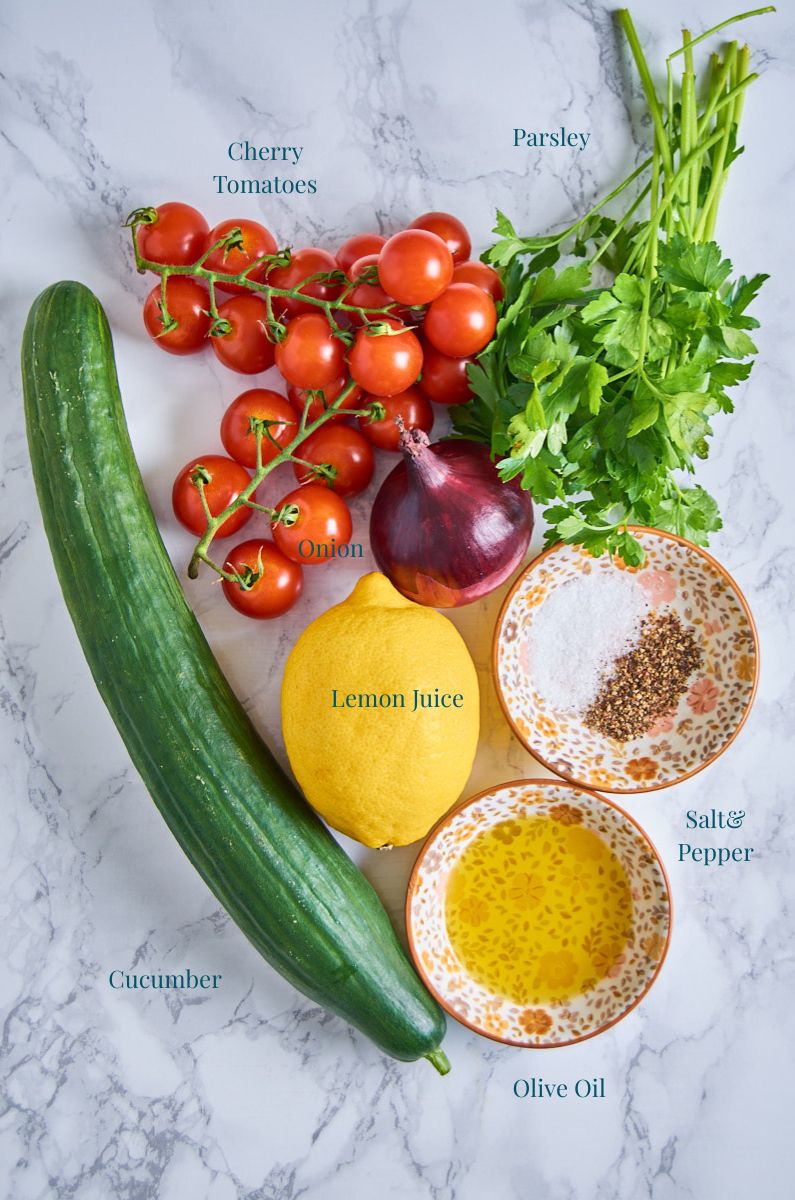 Juice the lemon. Chop both tomatoes and cucumbers into cubes. Chop the parsley.