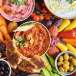 - Choose how to serve your mezze feast. You could use a large board, or like I did, some granite slates. Or scatter the dips across your table with plates of veggies and sides in between.