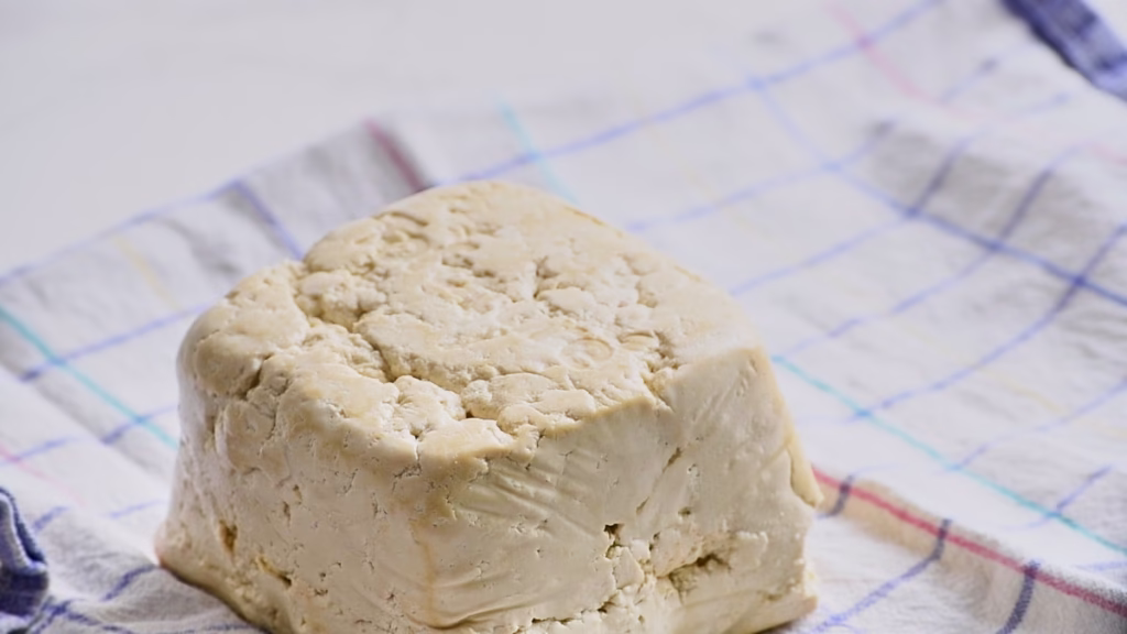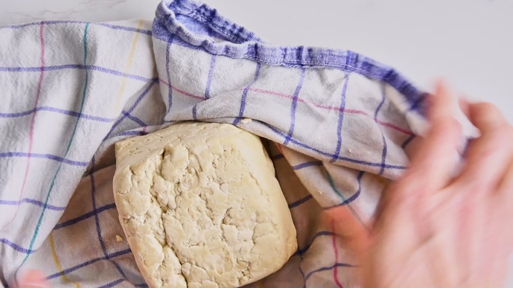 Wrap the unpacked tofu into a clean kitchen towel. It should have a few layers around it, so the moisture is absorbed. Put it on a plate or a chopping board with rim, just in case moisture does seep out.