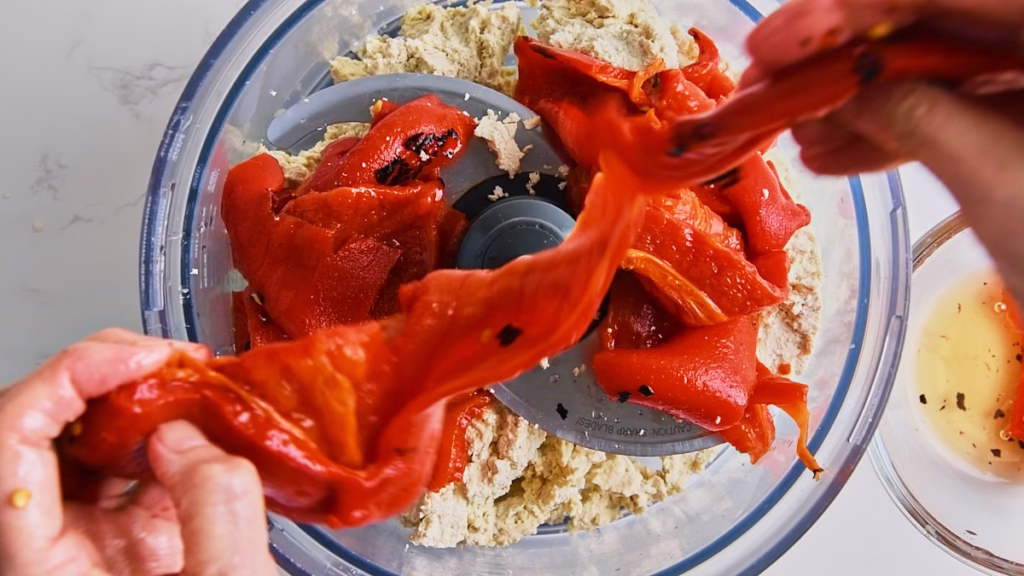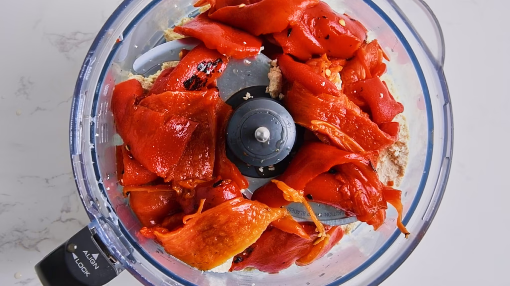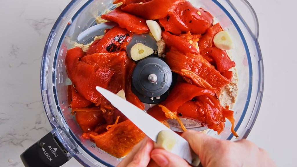 • Food Processor – Or a high speed blender like Vitamix. I do feel this dip works best in the food processor. It’s basic version without peppers (but with smoky chili oil) sure does, as it’s a bit too dry for the blender. Now, the peppers in this one add a bit more moisture, so it could be ok in a really high powered blender like Vitamix, but don’t even attempt it in, say, a Nutribullet, as it will kill the poor thing.