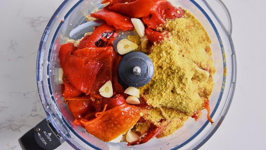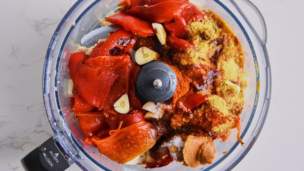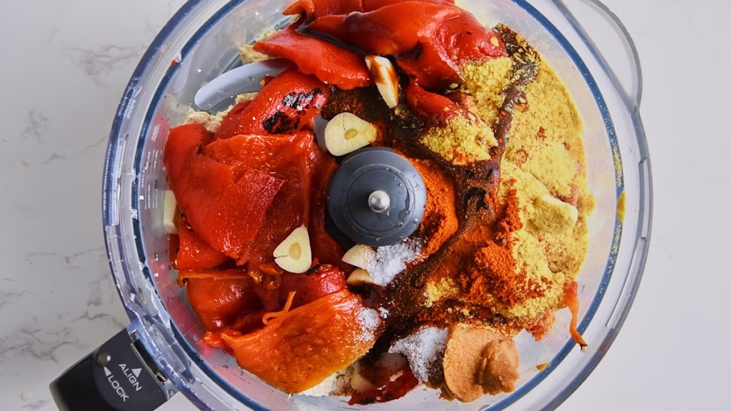 • Roughly tear the roasted red pepper into it and throw in the nutritional yeast, garlic, salt (start with 1 tsp), olive oil, lemon juice and smoked paprika.
