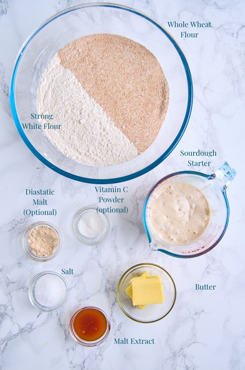 - In a large mixing bowl or the bowl of your stand mixer, combine the active sourdough starter, malt syrup, yeast, barley malt powder, and vitamin C powder and warm water. Stir well to dissolve all ingredients in the water.