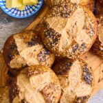 I usually make Wholewheat Sourdough Pretzel Buns about once every two months for myself, then freeze most of them in small freezer bags, to heat them up whenever I feel like Pretzel buns. Oven or air fryer work equally well here. Or you could freeze the dough rolls after they had their bath in the baking soda water. But personally I’d be a bit weary of ice crystals forming. Hence after baking for me. I also find that I just love how the crust crunches uo even more with the second bake.